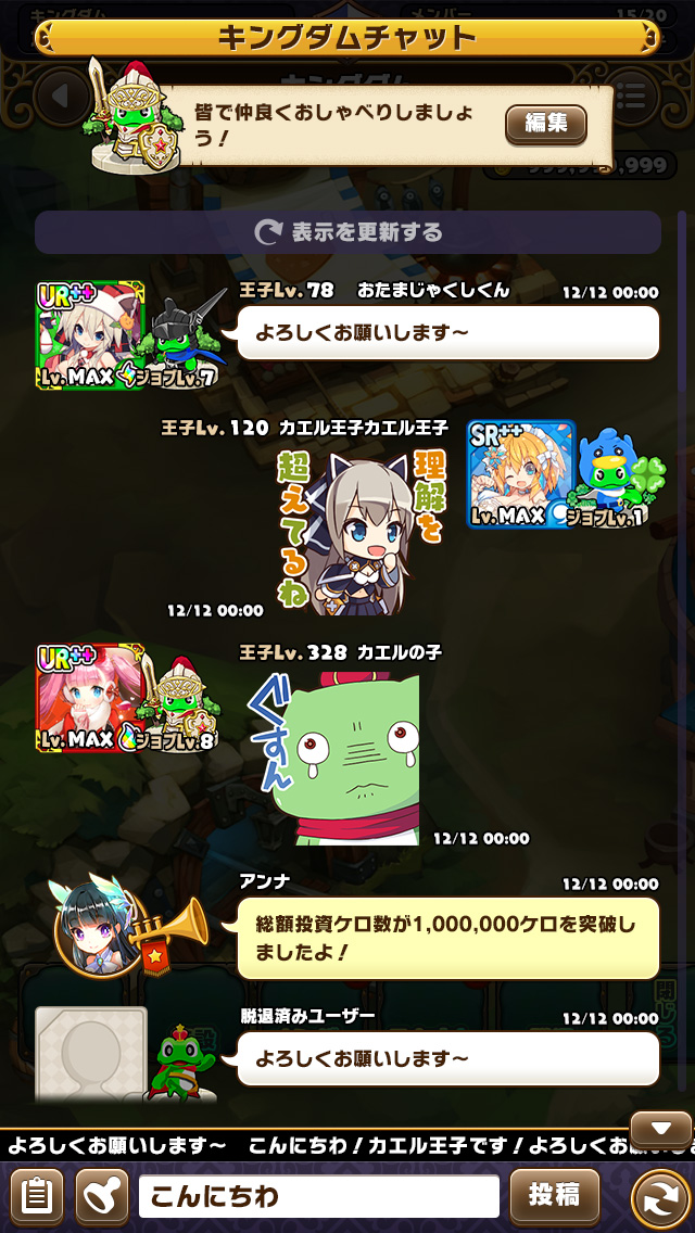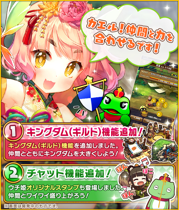 大型アップデートでは、新機能「キングダム」と、チャット機能を新たに実装いたしました。新機能「キングダム」では、「キングダム」内にバトルをさらに有利にできる効果を持った施設が登場、メンバーそれぞれが「ケロ」(※ゲーム内通貨)を投資することで、効果を増大させることができます。また「キングダム」では、ギルドのメンバー同士で会話やスタンプなどで交流を深めていただけます。今後はキングダムの特性を活かした機能も追加予定ですので、ご期待ください。