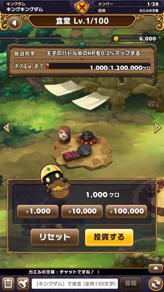 メンバーそれぞれが「ケロ」(※ゲーム内通貨)を投資することで、クエストを進めるのに有利な効果を得ることができます。